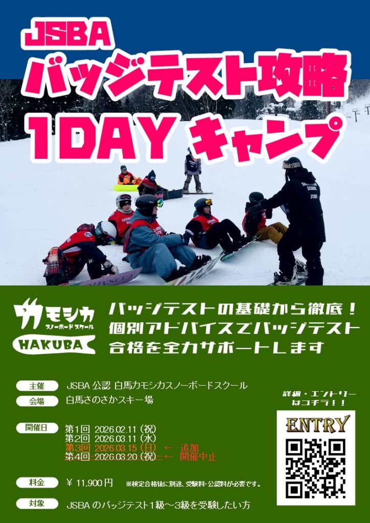 スノーボードのバッジテスト合格を目指す方のために、JSBAバッジテスト攻略1DAYキャンプを開催いたします。